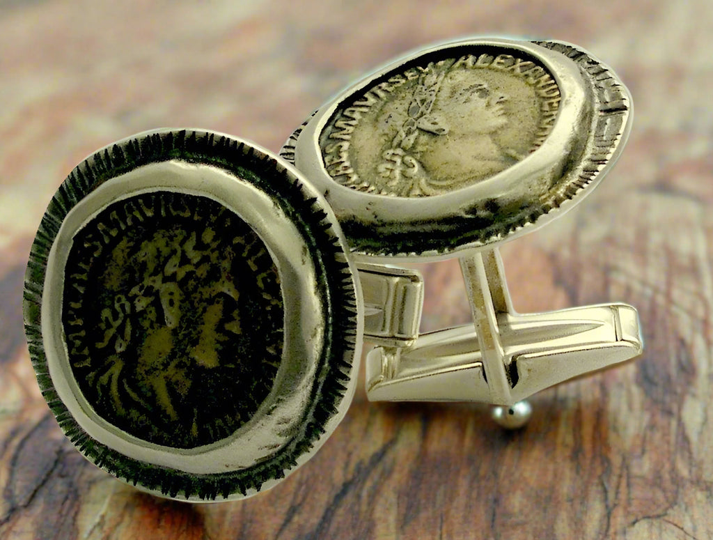 Elevate your style with these antique-style Roman coin cuff links. The bronze coins, plated with oxidized copper, showcase a sterling silver circle, hand-hammered for an exquisite finish. Stamped with the image of Alexander Severus, these cuff links embody timeless elegance and historical allure.(C5009).