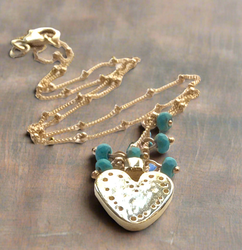 Adorned with an organic golden brass heart pendant and accented by turquoise stone beads, this necklace exudes elegance. It is delicately suspended from a gold-filled chain, adding a touch of sophistication to any ensemble.N2024.