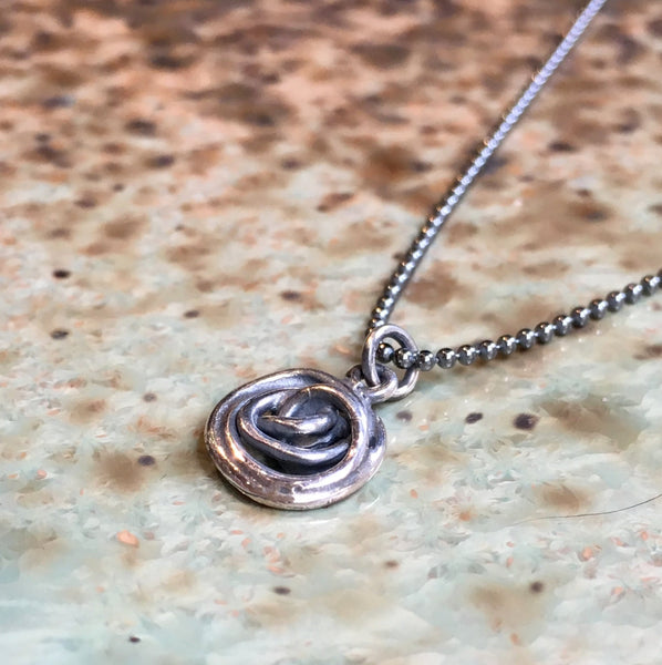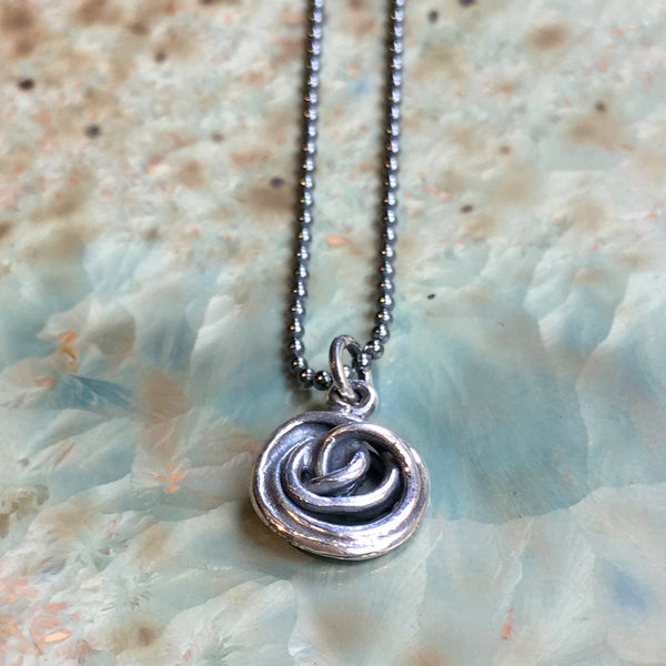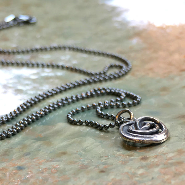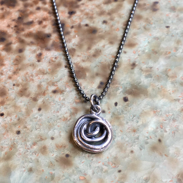 This is a pretty and dainty sterling silver spiral pendant on a dainty oxidised chain. You can wear it by itself or layer it.