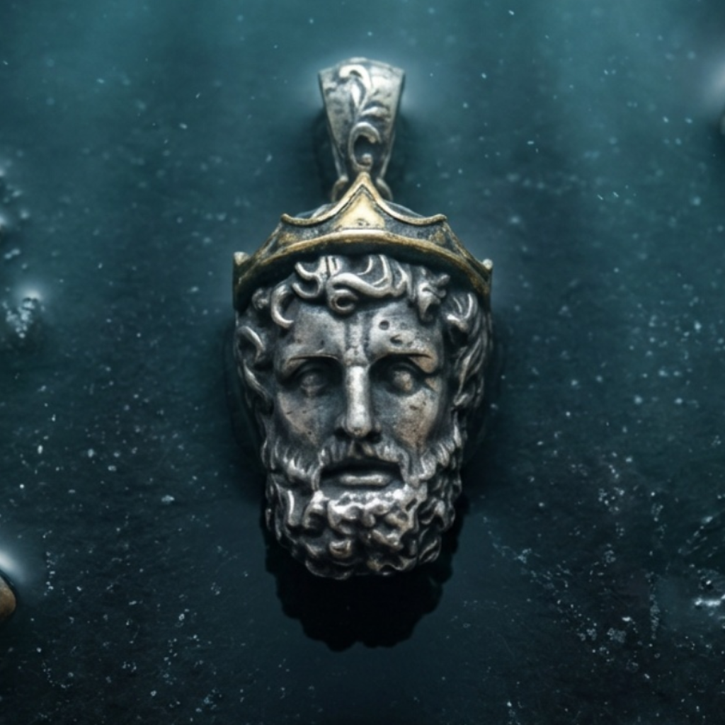 Poseidon rises from the depths in sculpted relief; crowned and storm-eyed. Under a wash of abyssal light, the pendant reads like something dredged from a drowned temple: ancient, powerful, and alive. Lord of the Depths is a wearable artifact for those who carry the ocean within: commanding, elemental, and impossible to ignore.