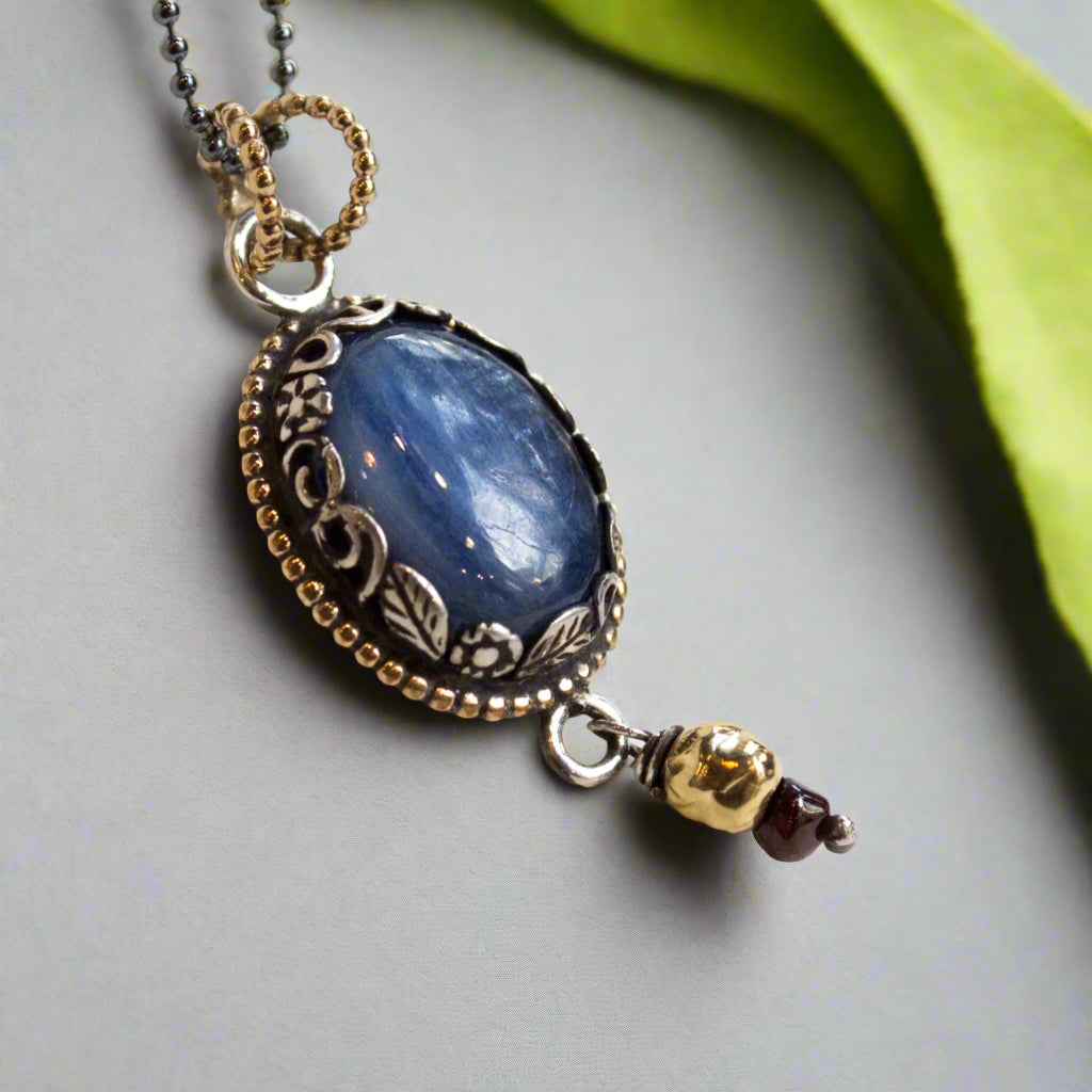 Adorn yourself with this exquisite necklace featuring an elegant floral design. A captivating oval blue kyanite stone takes center stage within a sterling silver setting, accented by gold balls around the bezel. Below the stone, a delicate garnet and a gold bead add a charming touch to complete the look. N2018.