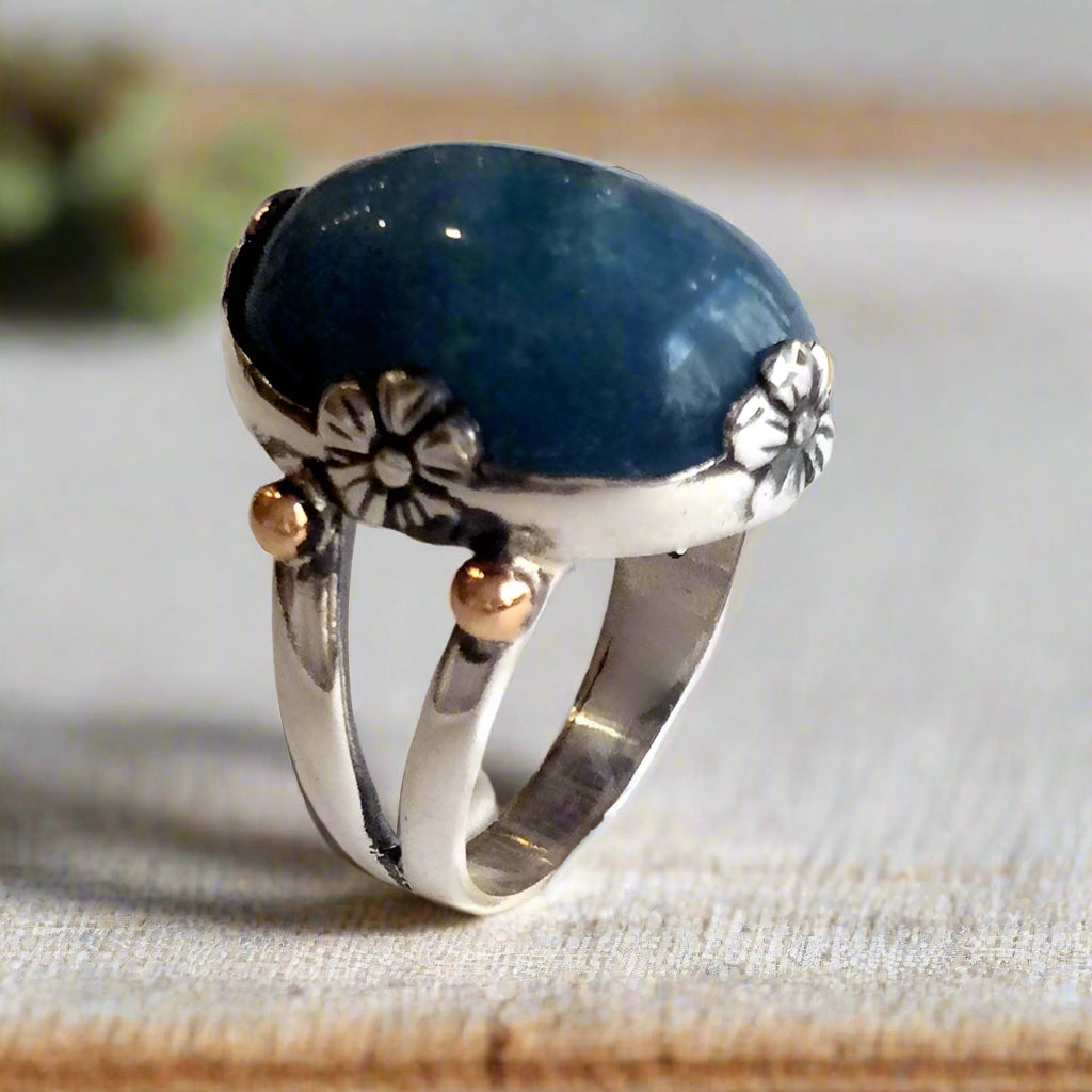 A milky aquamarine oval gemstone is set in a silver floral bezel. Two yellow gold balls are soldered on each side of the bezel. (R2061).