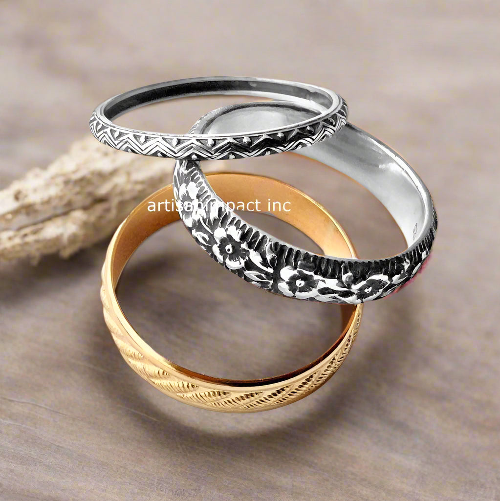 A very unique trio of stacking bands exposes a great combination of yellow gold band with 2 silver bands. R2227T.