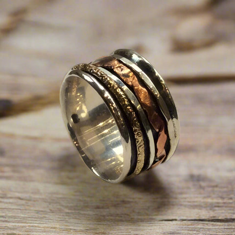 This incredible band is a combination of silver , gold and brass spinners. The main band is oxidized sterling silver with a dotted design along the edges. The main hammered ball spinner is made of brass, accompanied with additional spinners; one silver and two gold.(R2629).
