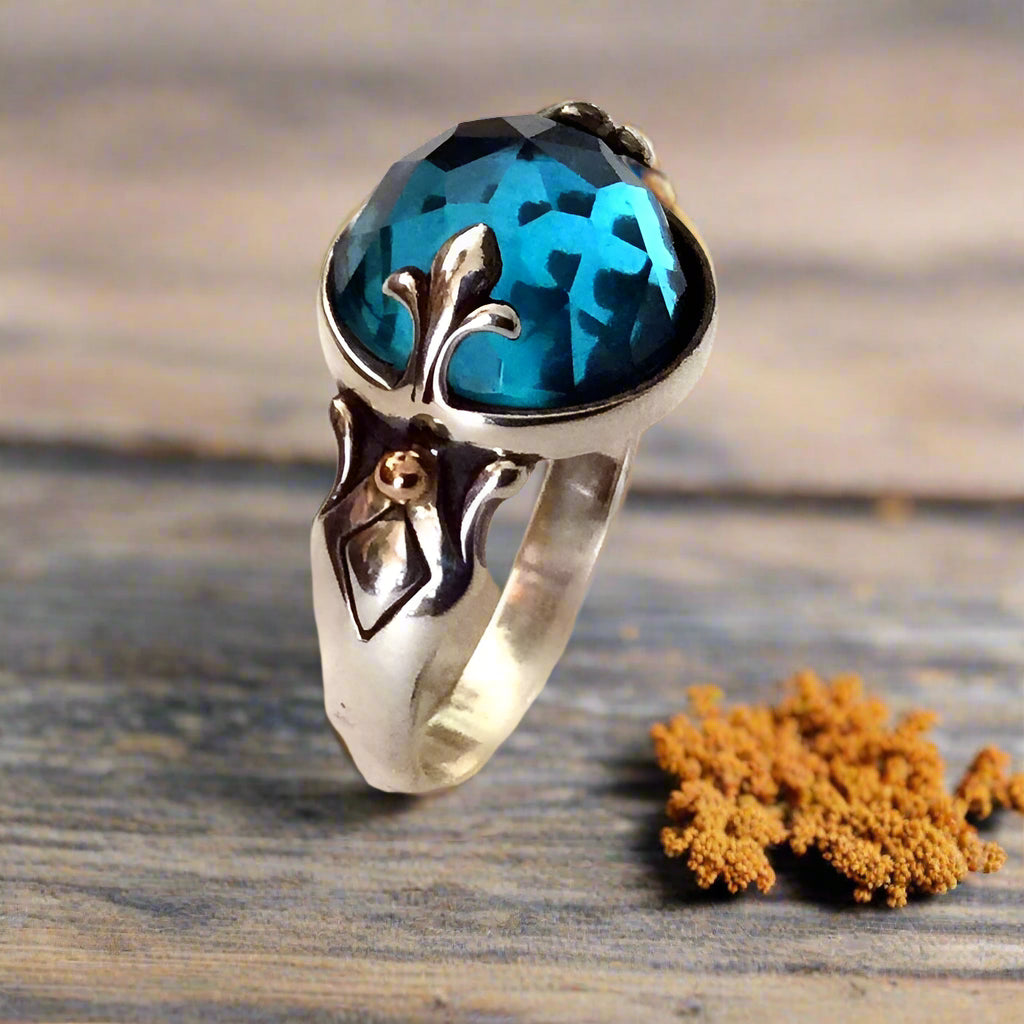 A pretty Blue London topaz ring with small gold balls soldered from each side. The two prongs with a fleur de lis design hold the stone. (R2182-1).