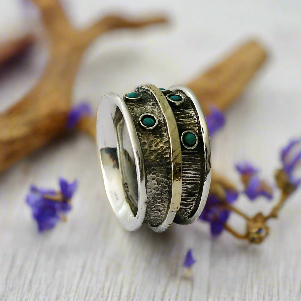 This ring features a blend of metals, with an oxidized hammered sterling silver band as the base. The top showcases a yellow gold accent adorned with tiny turquoise or opal stones. R1711G