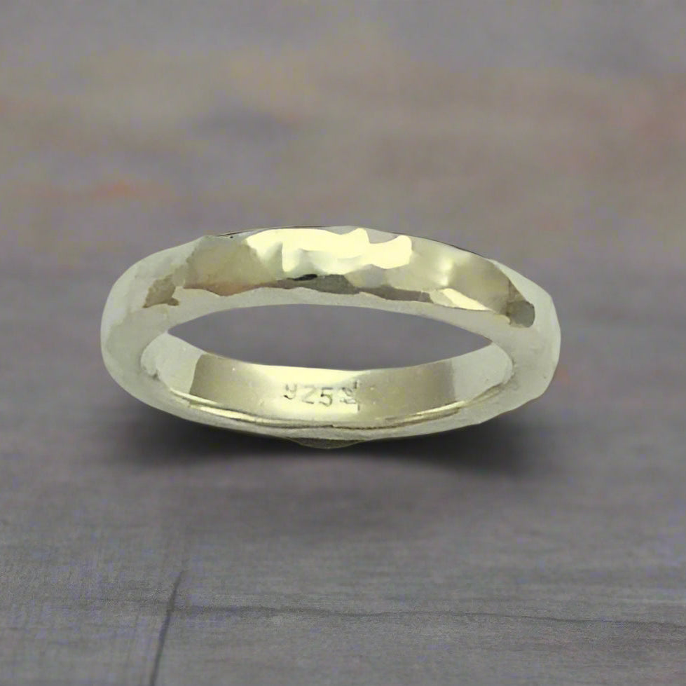 This is a shiny sterling silver unisex band. It has a delicate hammered touch. Simple and elegant, wear it alone or as a stacking rings set. R0900H.