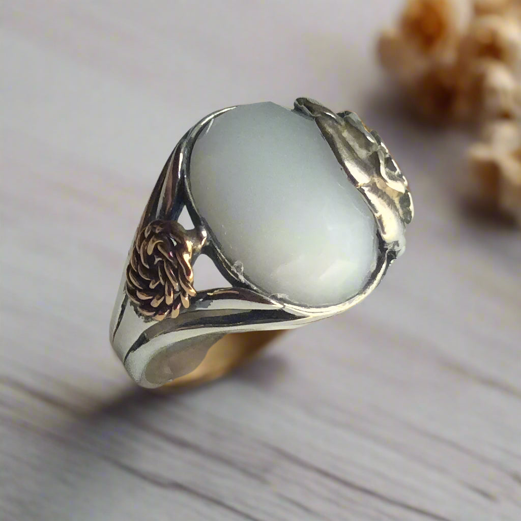This sterling silver floral ring is truly one-of-a-kind. Enhanced by an oxidized finish, it showcases a pristine white agate stone delicately set within the bezel. Adding a touch of elegance, the ring is adorned with a refined gold accent. R2208.