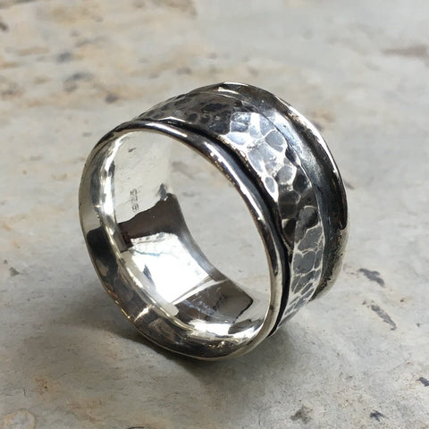 This exquisitely crafted band is adorned with intricate details. The main band and the two middle spinners are made of sterling silver, while the spinners on both sides feature gold dots, each uniquely designed to create a charming combination. R2095.
