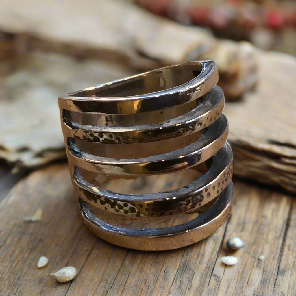 This is a unisex wide sterling silver band with open strips detailled with hammered dots. The oxidized silver comes together to create a bold yet organic look. R2307