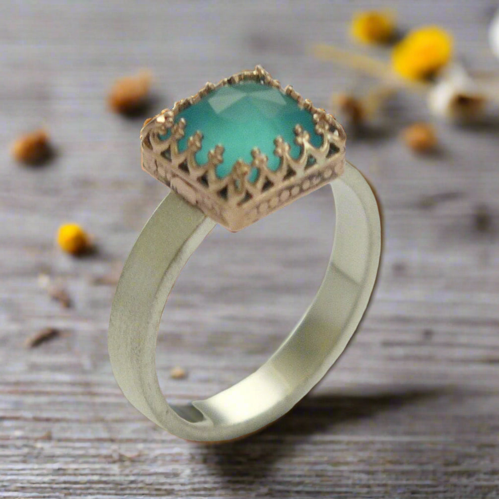 A square, rose-cut, ocean quartz gemstone sits at the top of a sterling silver mounting. The Victorian-style 10k rose gold crown contrasts with the matte and hammered sterling silver band. R1095H.
