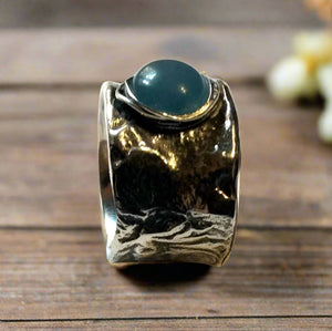 Simple sterling silver etched band with a milky aquamarine gemstone set in a sterling silver nest. R2158