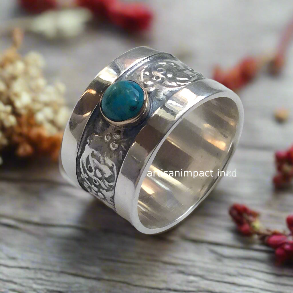 This floral band has is set with a turquoise stone in a gold bezel. It's very pretty and will be great for a daily wear. R2118