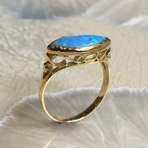 A golden brass antique-inspired ring. In the mounting, a blue opal marquees gemstone set with intricate detailing. RK1215.