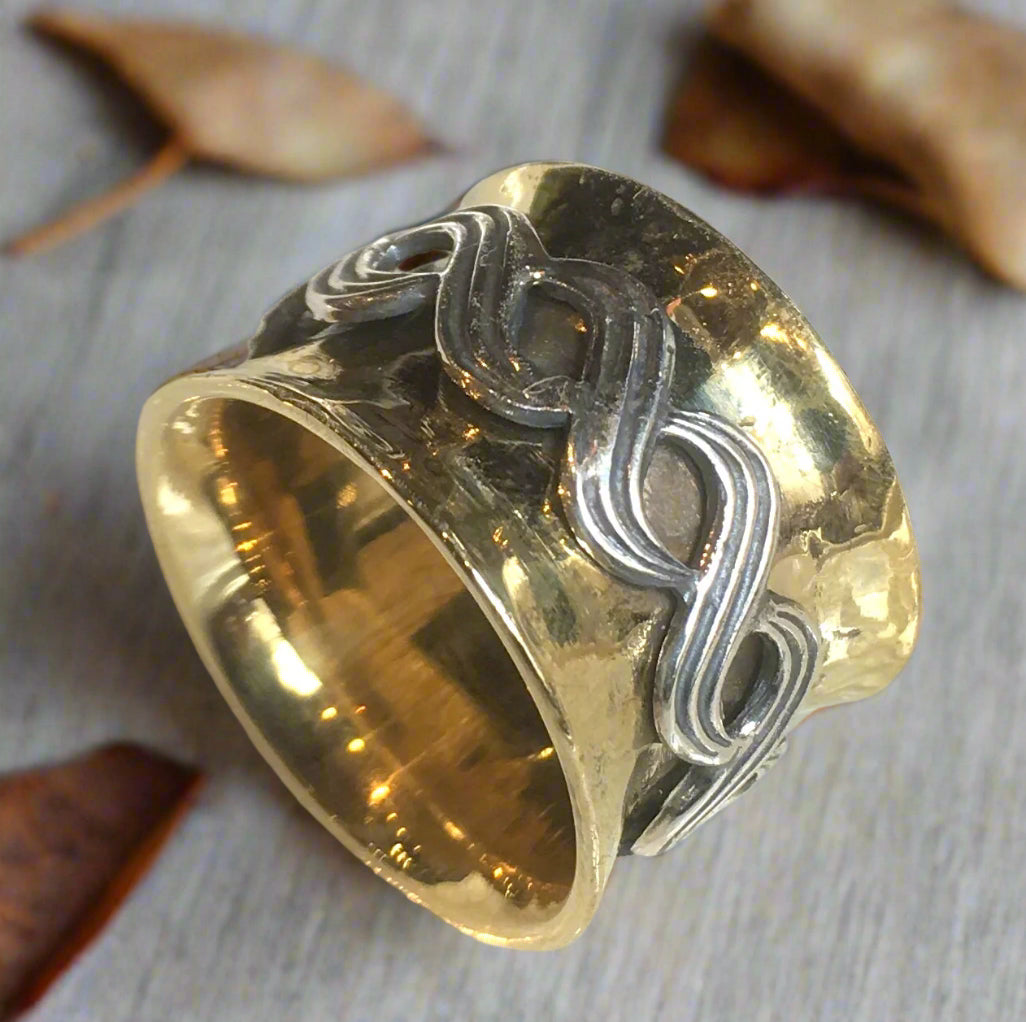 This unisex meditation band is a charming choice for all occasions. The main band, crafted from shiny brass, possesses a subtle oxidation and hammered texture. Embracing it is a spinner made of sterling silver that twists to form a playful and engaging design, adding a touch of whimsy to this versatile and elegant ring. Please note that brass rings may turn your finger green, depends on the acidity on the skin. RK1739.