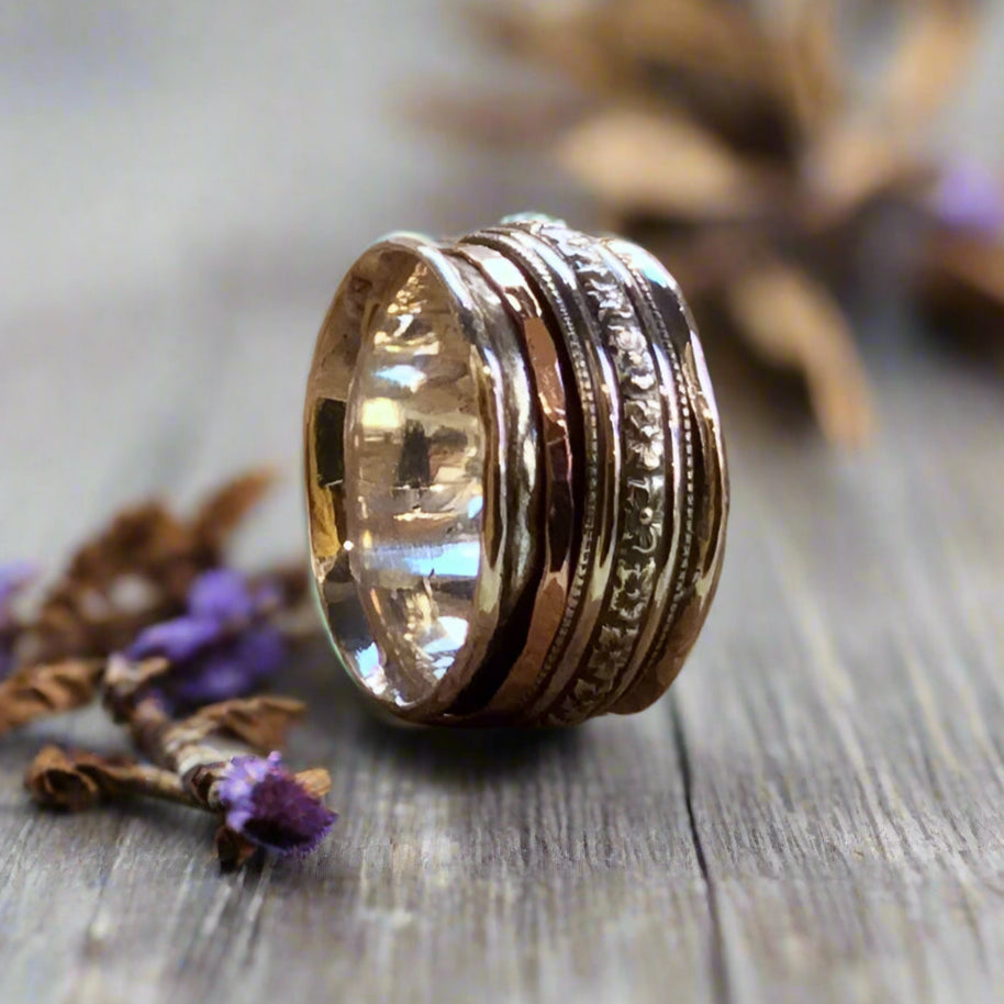 This band is made to either be worn for men or women. It's a simple design with a touch of both silver and rose gold. The main band is made of oxidized, hammered sterling silver wrapped with silver floral and rose gold hammered spinners. (R2291)