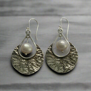 Nice textured silver piece. Very unique shape and accented with perfect pearls in the middle of the drop. The silver is oxidized to really show off the texture and pearls.