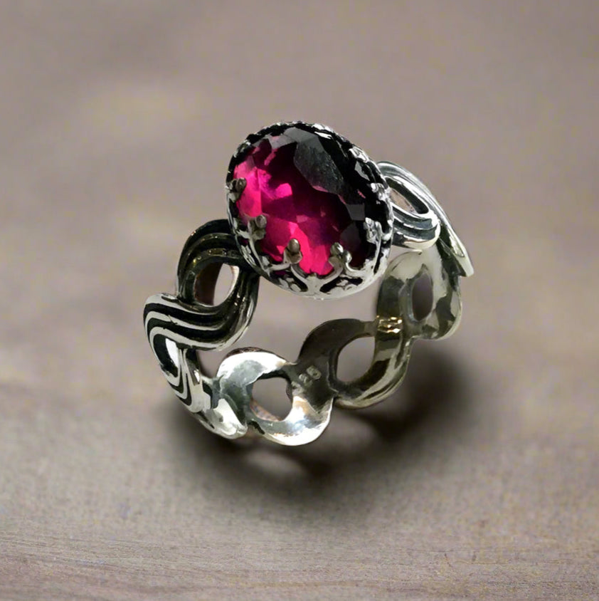 Pretty braided sterling silver band with an oval crown bezel set with a stunning ruby stone. R2133.