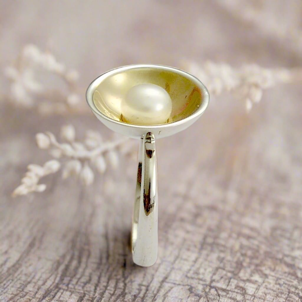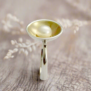 Silver rose gold ring, shiny ring, bowl ring,simple Pearl ring, June birthstone ring, two tone ring, engagement ring - Serenity R1569G