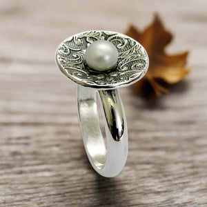 This astonishing sterling silver filigree pearl ring has a round structure. The ring is oxidized. R1603.