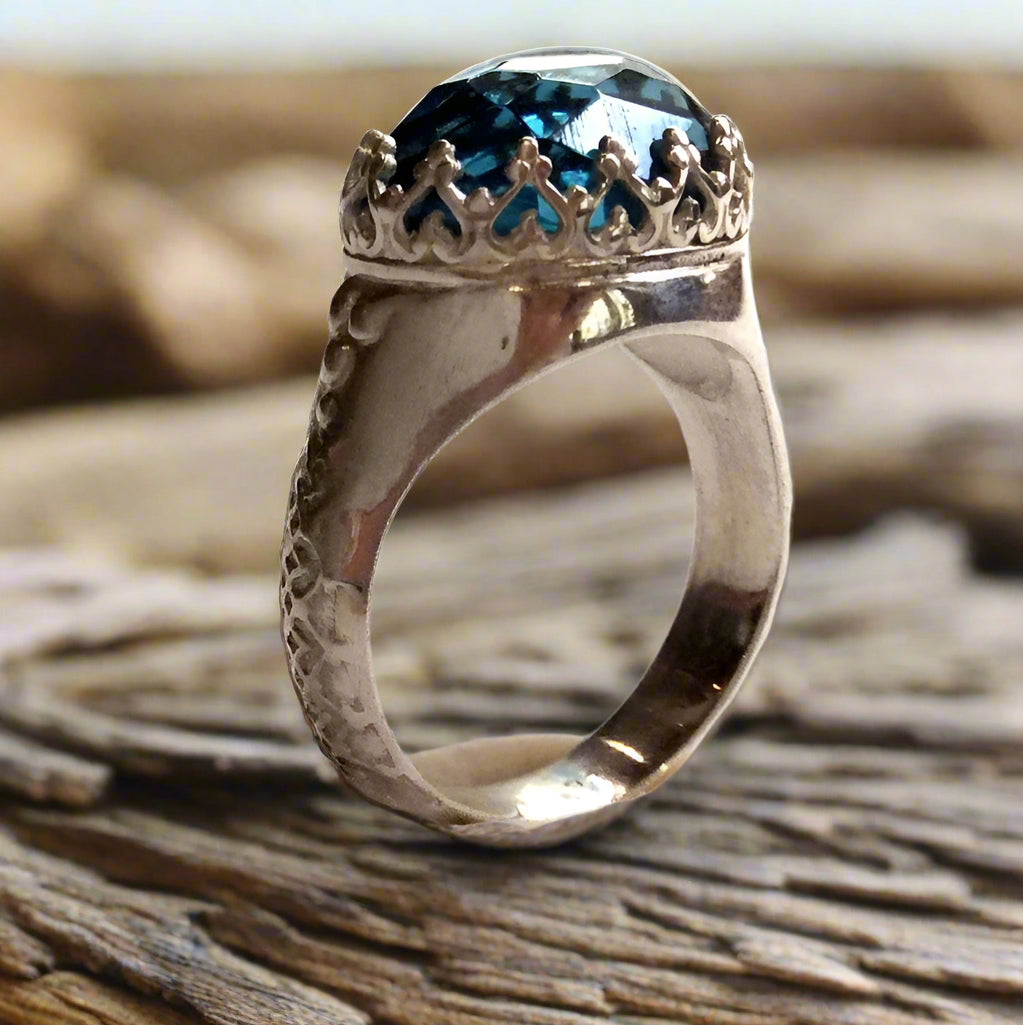 This stunning ring is meticulously crafted from 14k gold-filled material, embellished with a captivating blue London topaz stone delicately set on its surface. R2052-1.