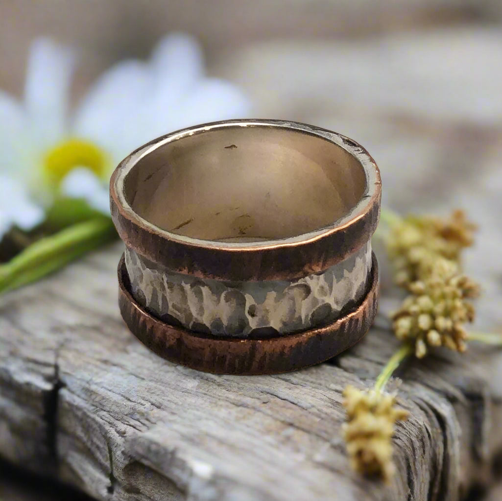 This beautiful band is unisex and makes a wonderful wedding band. It's made of oxidized sterling silver with copper edges. (R2318).