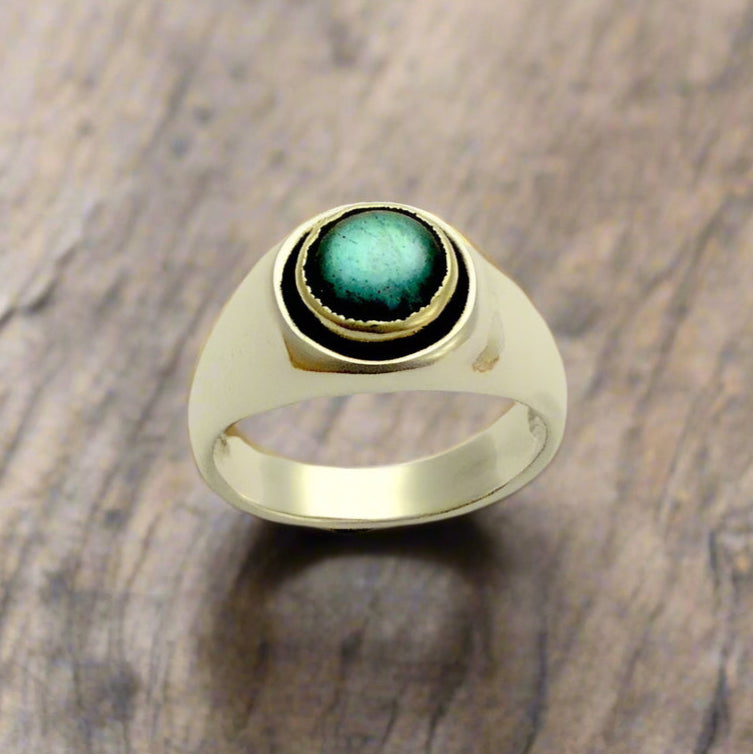 Introducing our versatile unisex ring, showcasing a stunning labradorite cabochon stone delicately set within a luminous yellow gold bezel. Encircling this radiant centerpiece is a distinctive oxidized silver ridge, adding depth and character to the design. Labradorite, a gemstone found in metamorphic and igneous rocks and belonging to the feldspar category, captivates with its iridescent beauty. Its name pays homage to its primary geographical source, Labrador, Canada. R1499A.